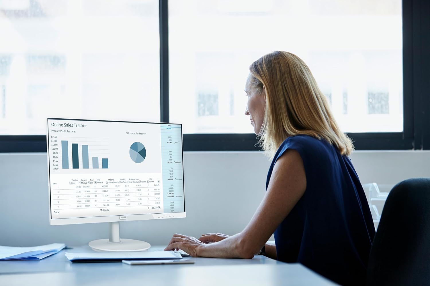 Angle-stable IPS panel, 2x 2 watt stereo speakers, matt display, headphone out, slim frame in white, compatible with VESA mount 100×100, removable stand