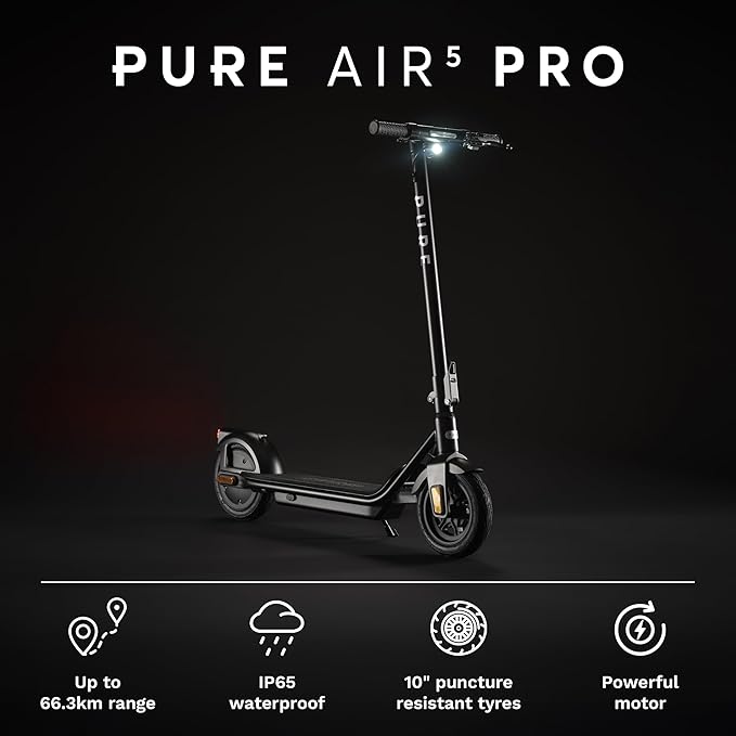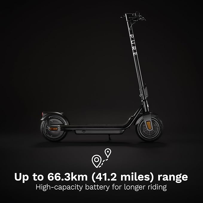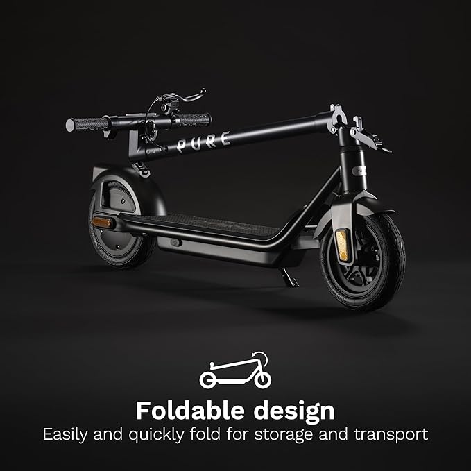 Discover the convenience of urban transportation with the Pure Air3 Electric Scooter for adults. This lightweight, foldable scooter is built with a durable aluminum frame, featuring 10-inch tubeless tires and solid plastic wheels for a comfortable, low-maintenance ride. The T-bar or straight handlebar offers a secure grip with contoured design, suitable for city commuting and urban transportation. This kick scooter has a maximum distance range of up to 3 kilometers, equipped with indicators and special features like foldability. Manufactured by Pure, the Pure Air3 Electric Scooter is a reliable choice for your city commute, available in the scooter category with the item type keyword ELECTRIC_SCOOTER.